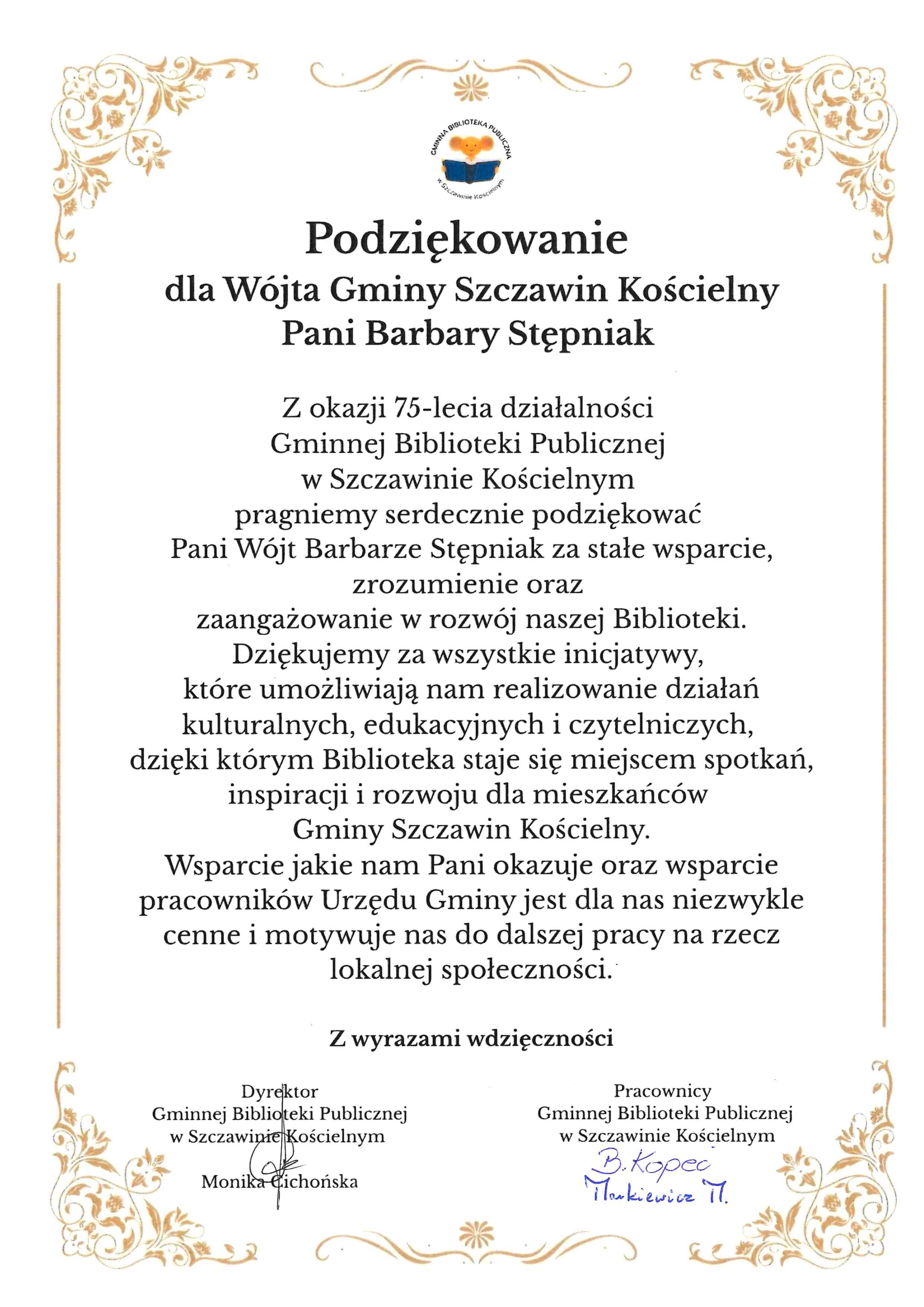 Gminna Biblioteka Publiczna w Szczawinie Kościelnym Pani Monika Cichońska wraz z Pracownikami