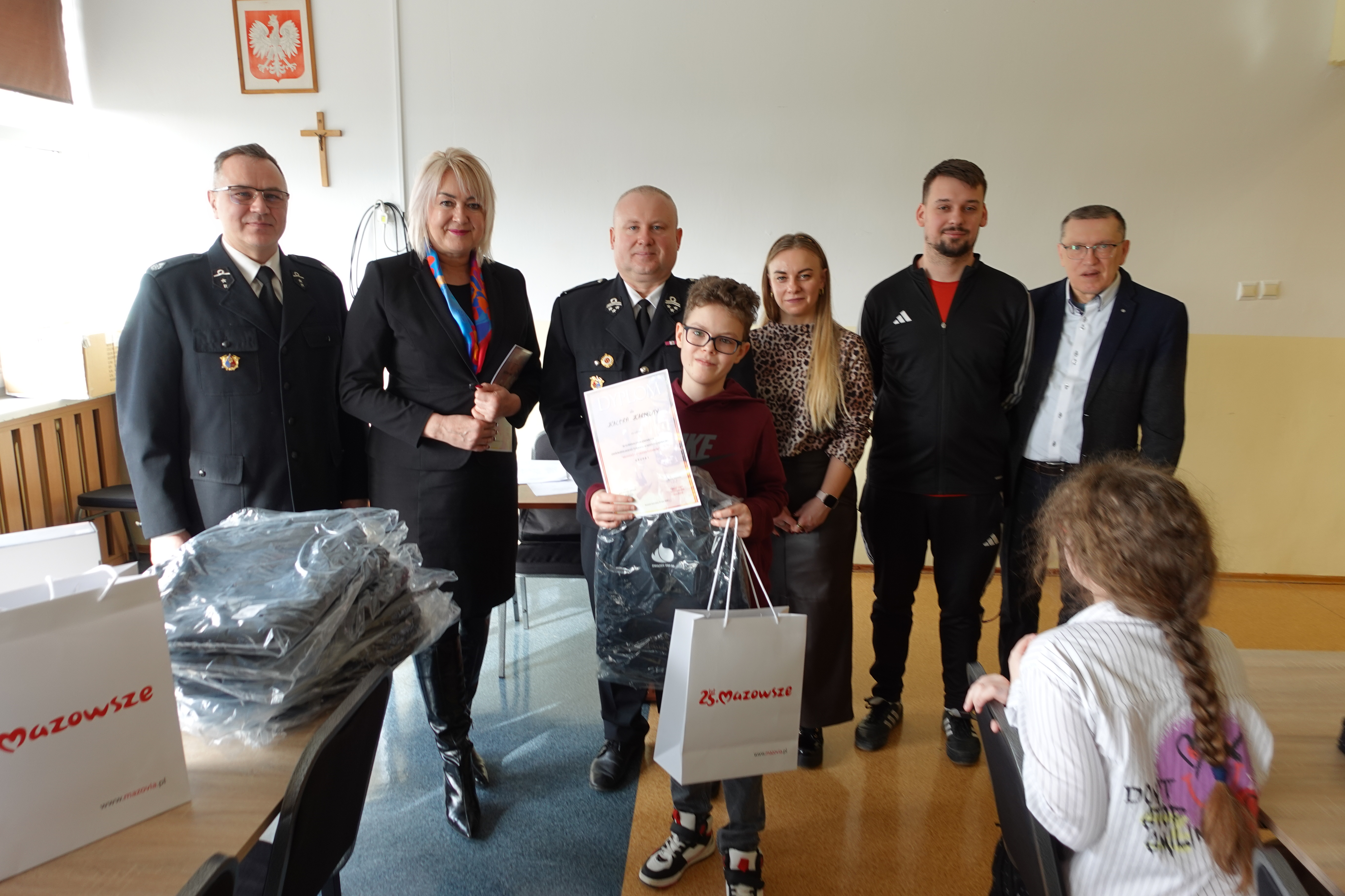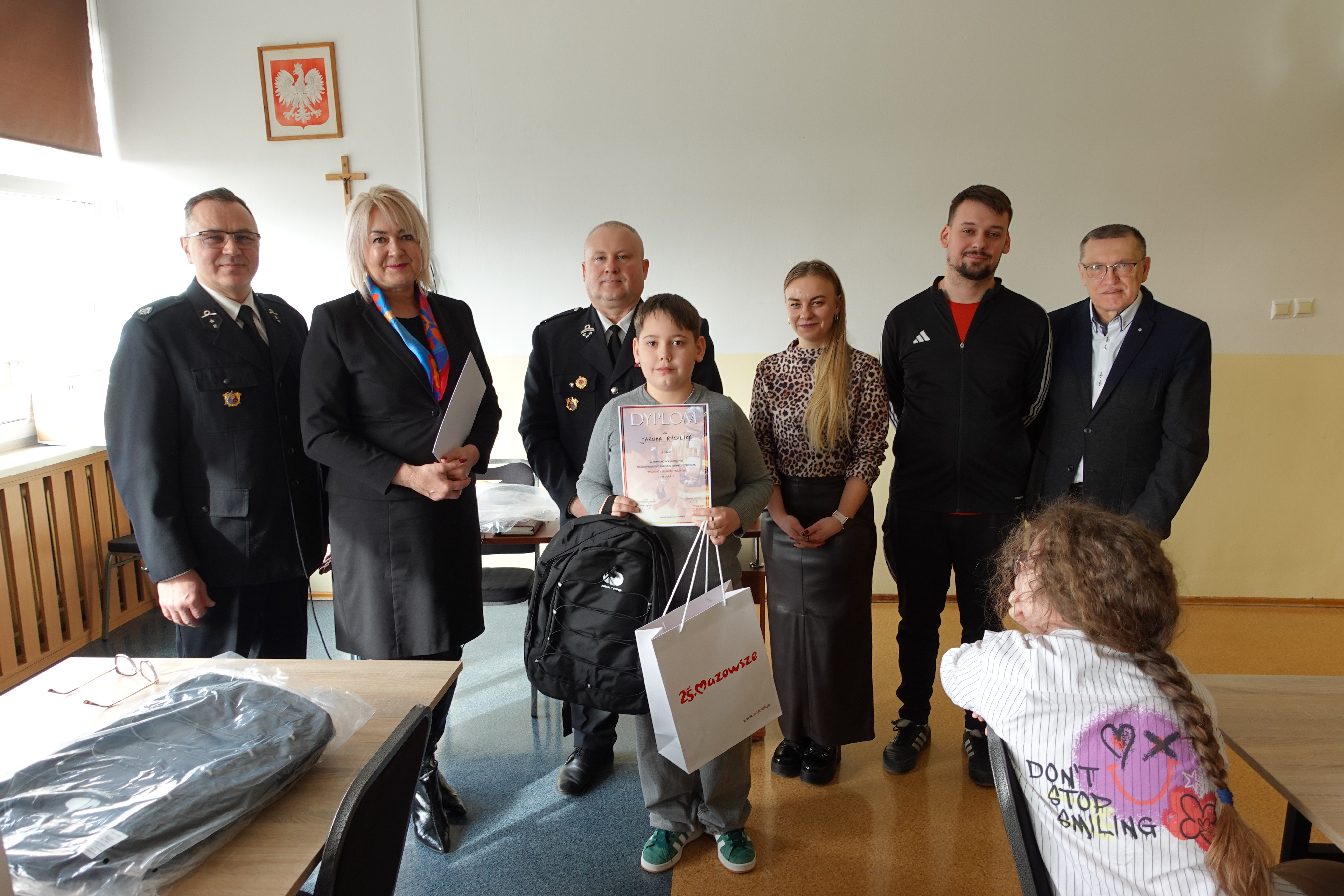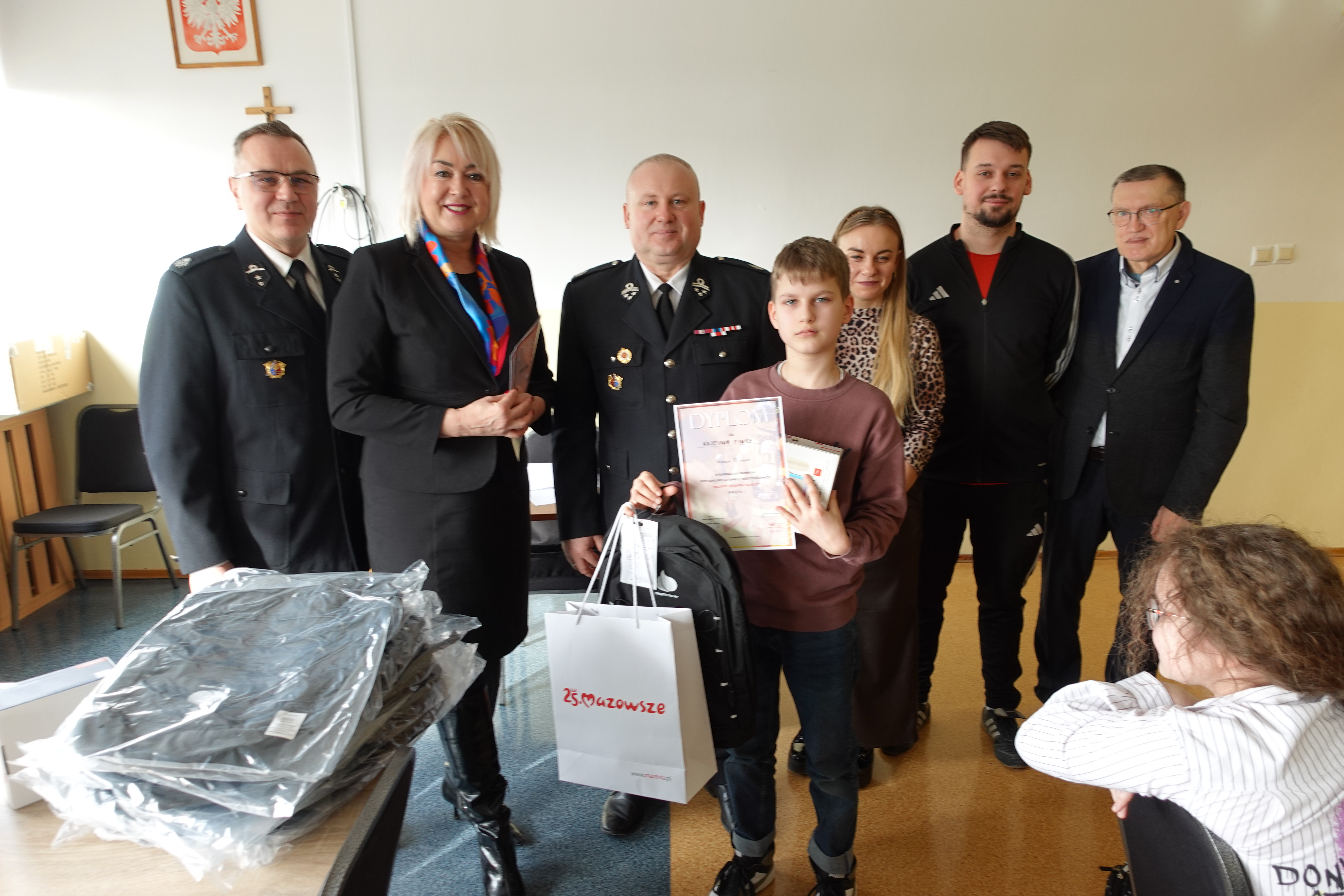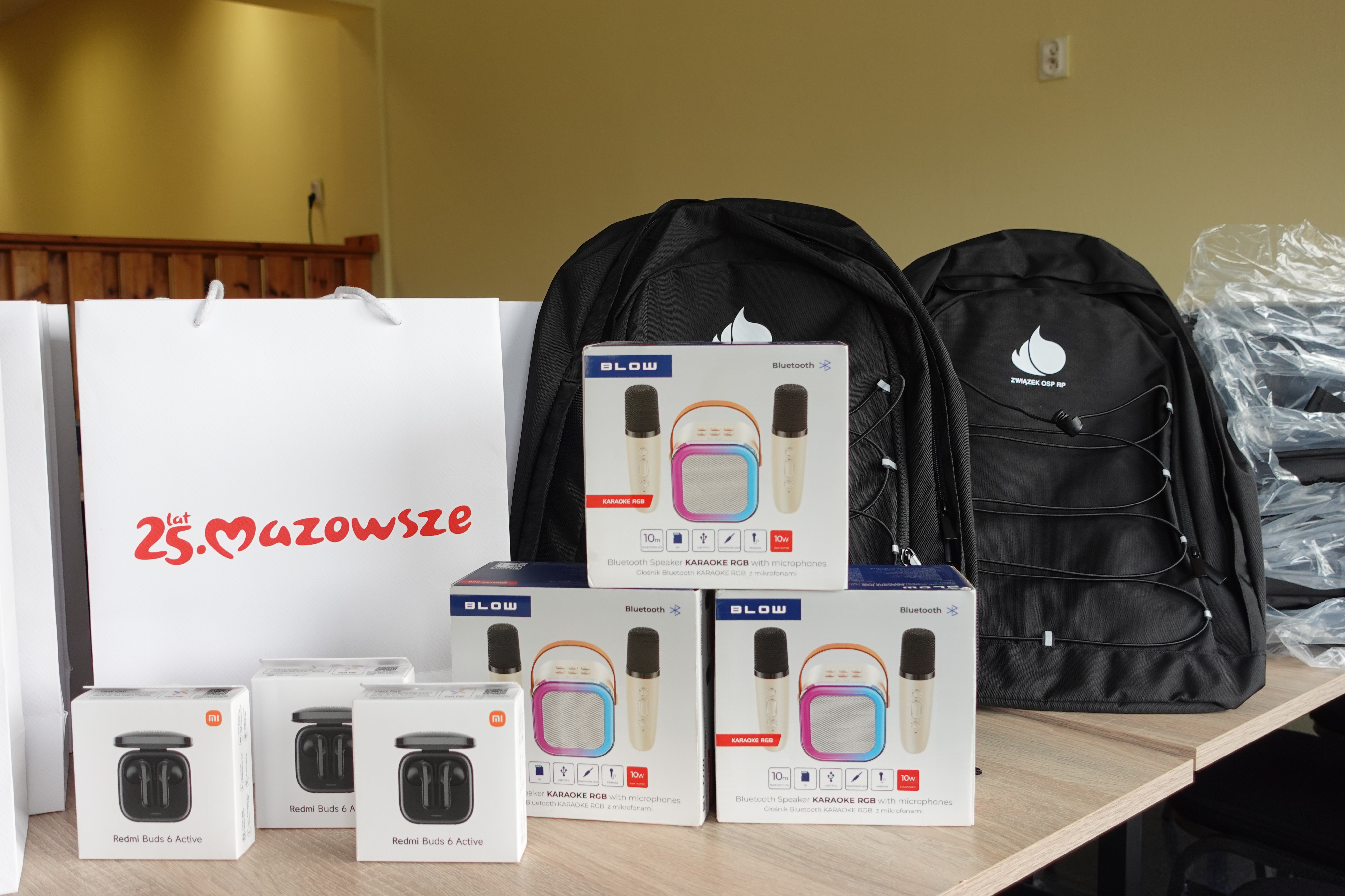plecaki ufundowane przez ZOSP RP o łącznej wartości 600 zł oraz odblaski i worki z gadżetami przekazane od Marszałka Województwa Mazowieckiego dla wszystkich Uczestników.