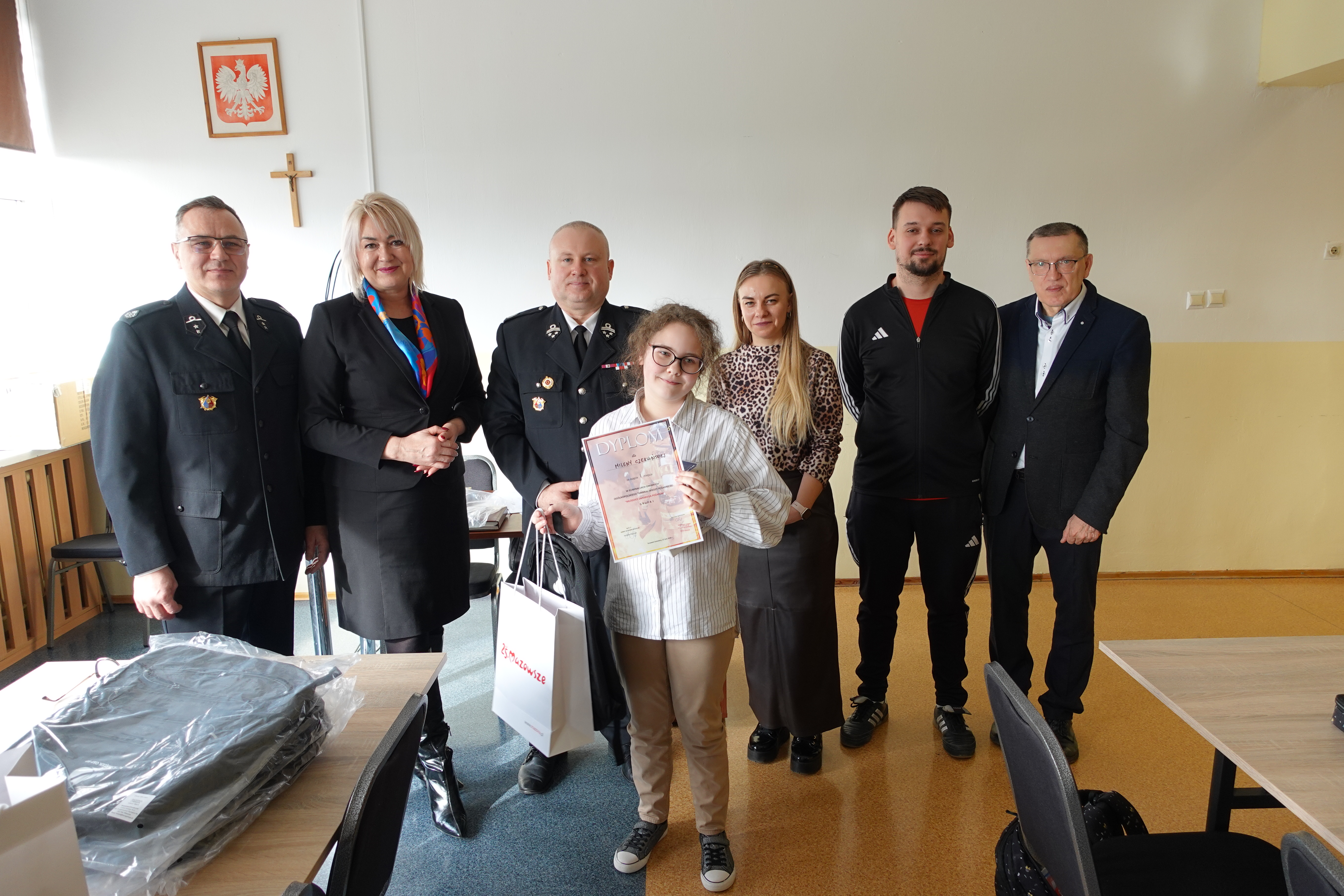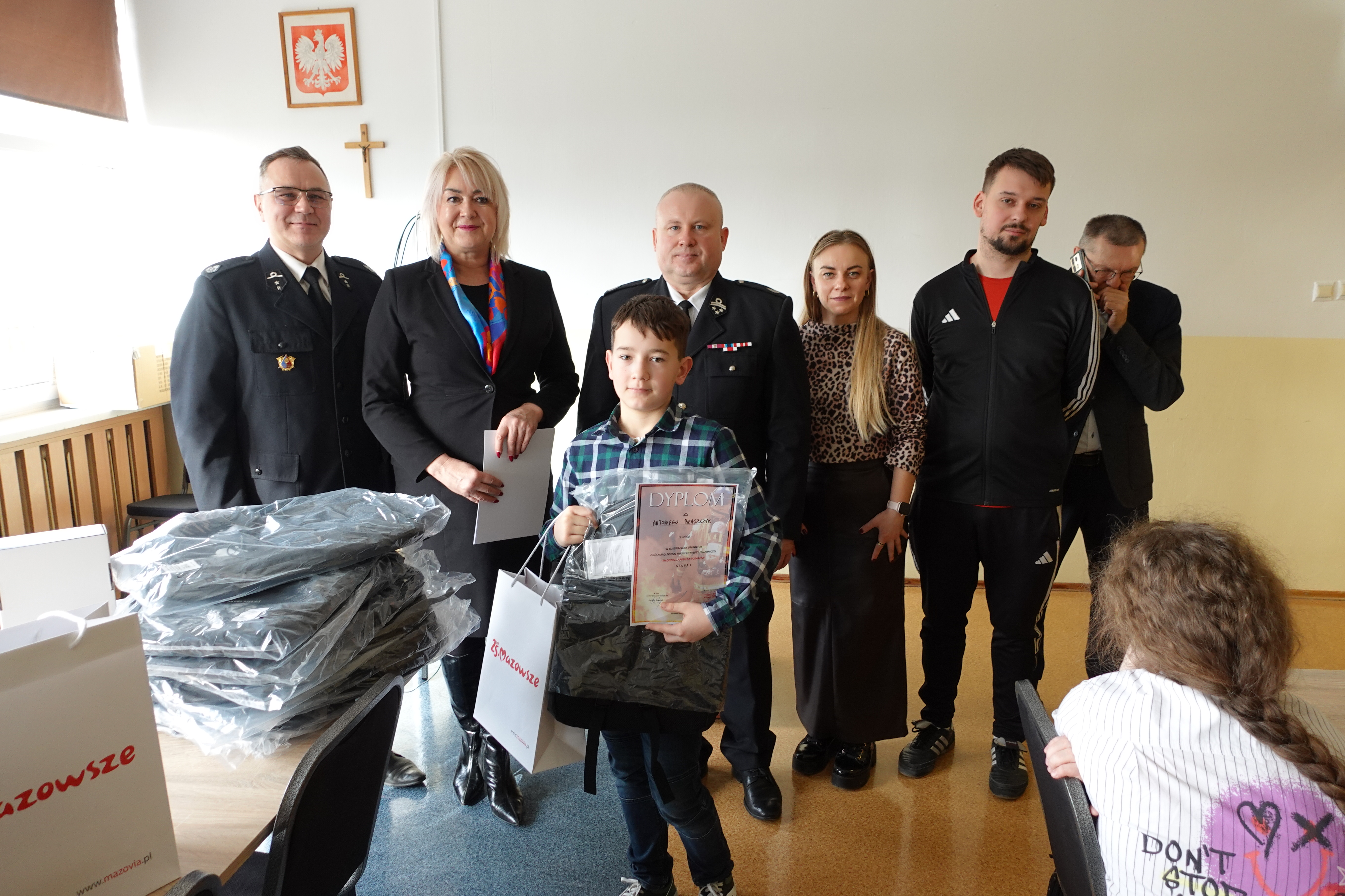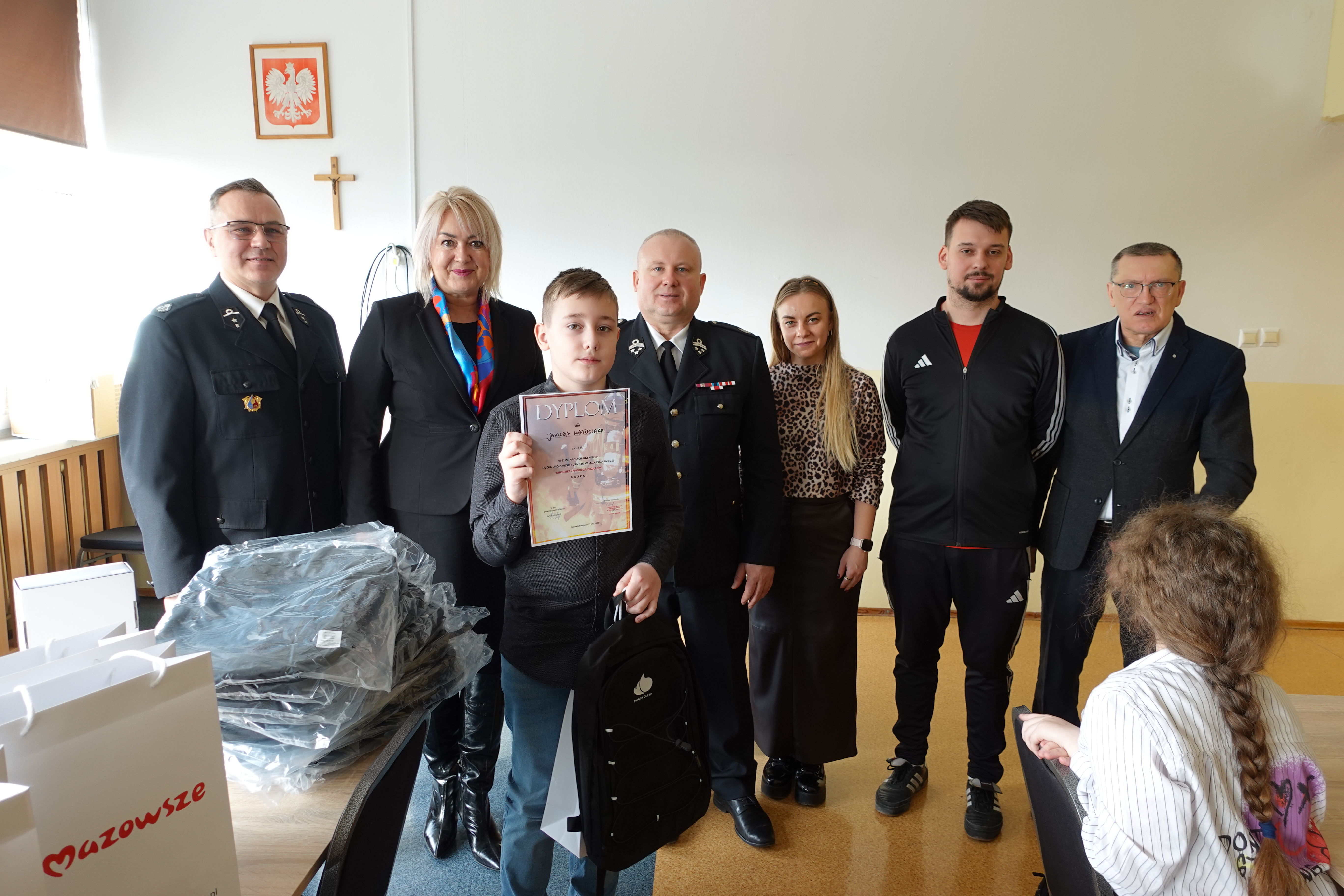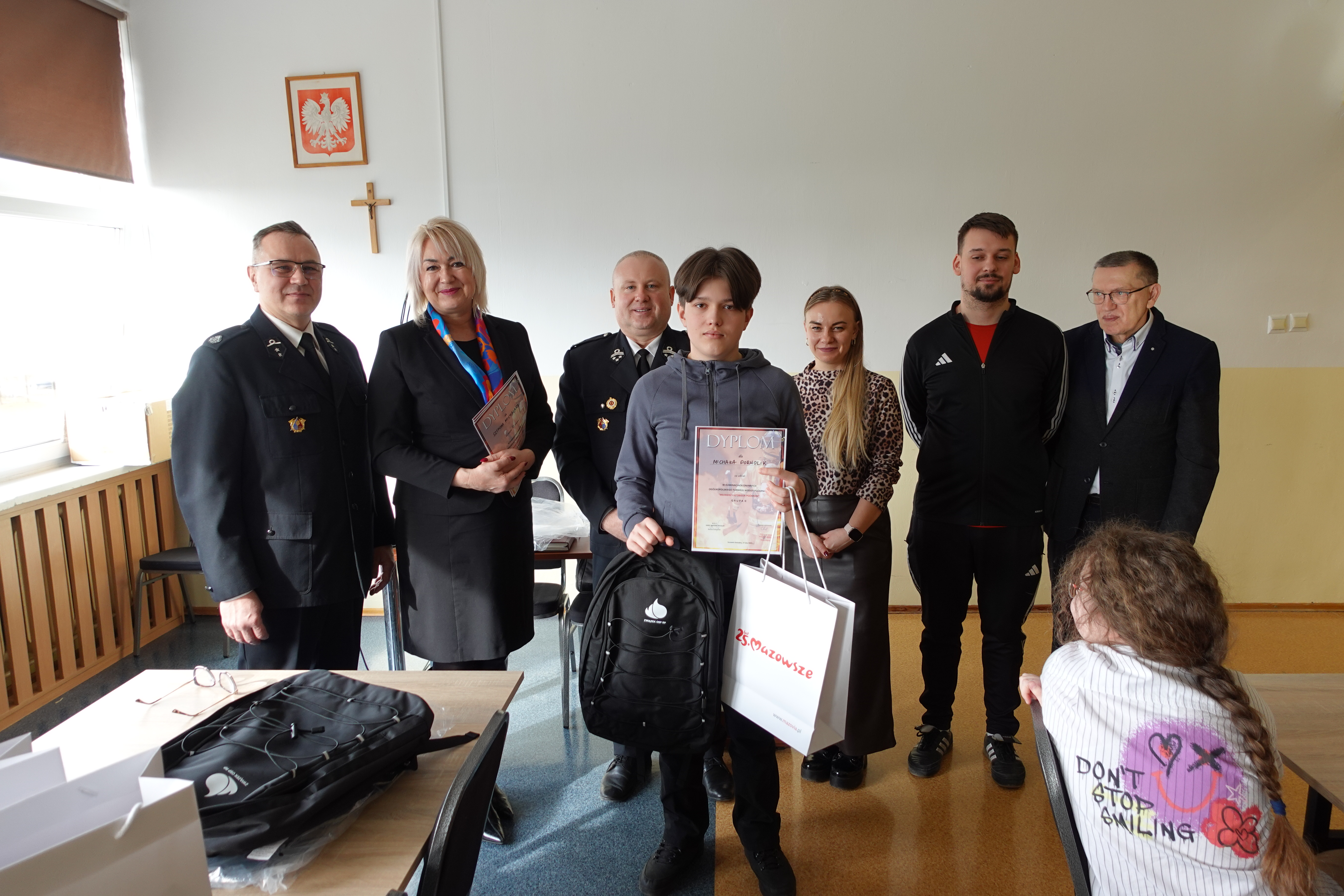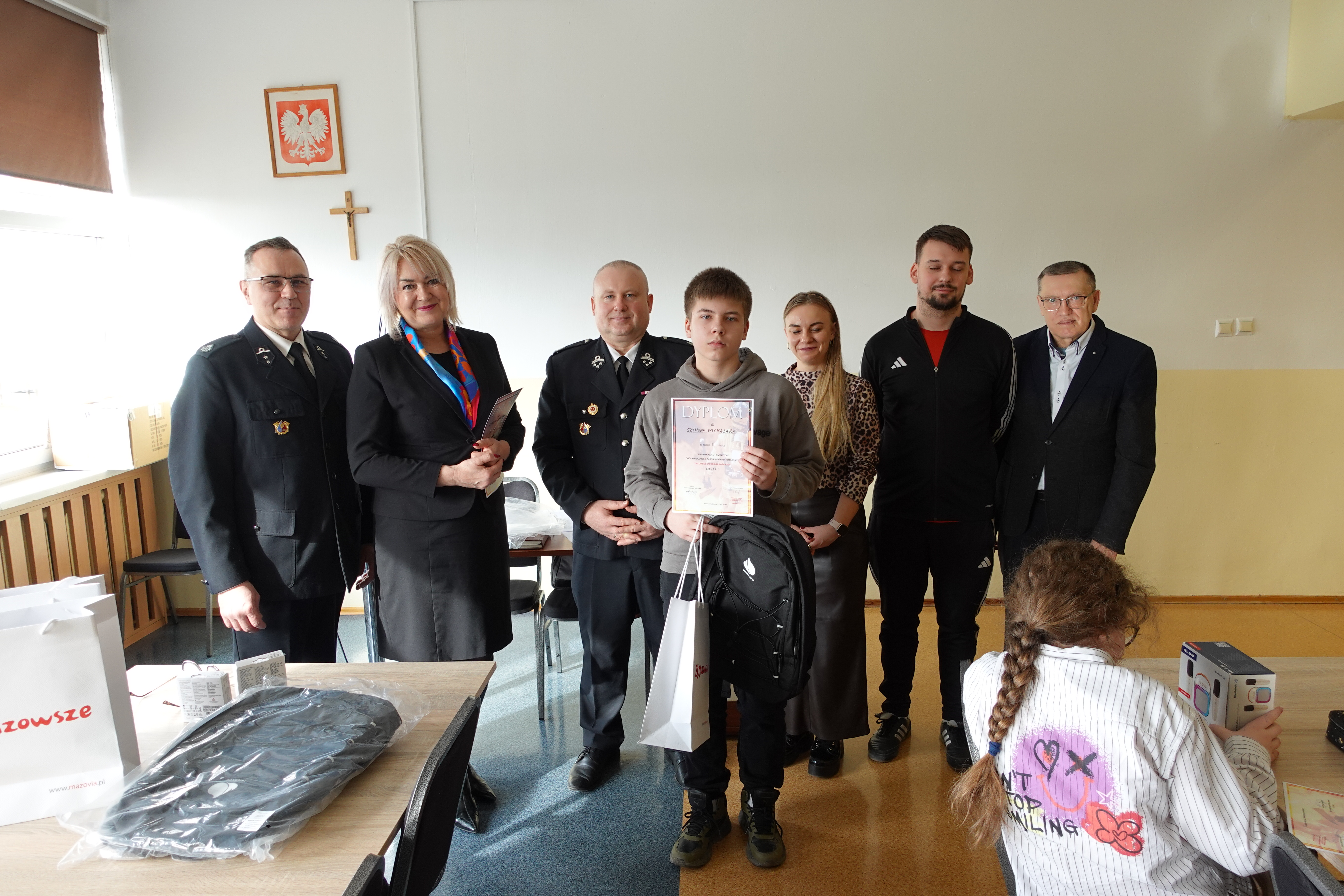 plecaki ufundowane przez ZOSP RP o łącznej wartości 600 zł oraz odblaski i worki z gadżetami przekazane od Marszałka Województwa Mazowieckiego dla wszystkich Uczestników.