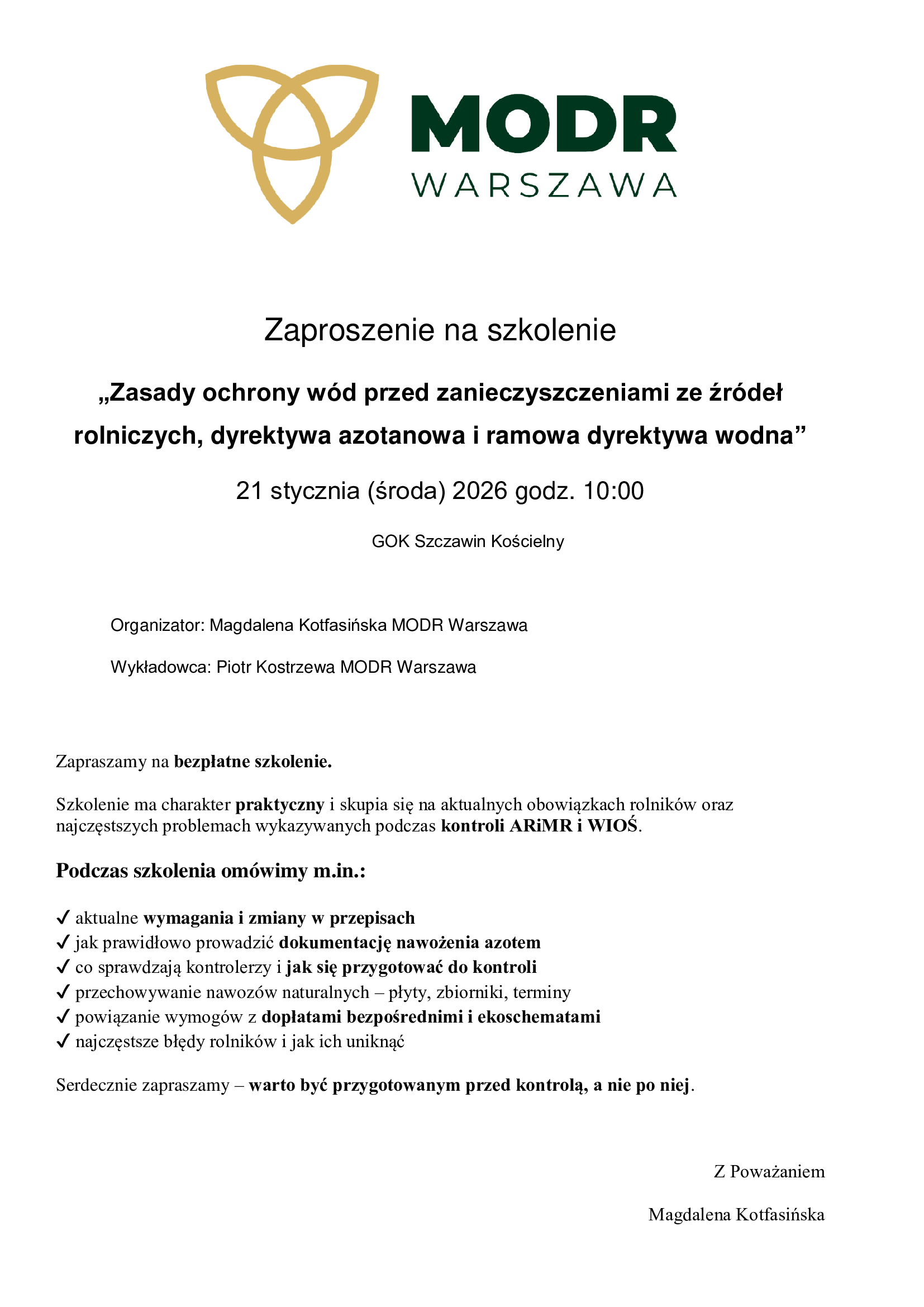 ZAPRASZAMY NA BEZPŁATNE SZKOLENIE - ZASADY OCHRONY WÓD PRZED ZANIECZYSZCZENIAMI ZE ŹRÓDEŁ ROLNICZYCH, DYREKTYWA AZOTANOWA I RAMOWA DYREKTYWA WODNA