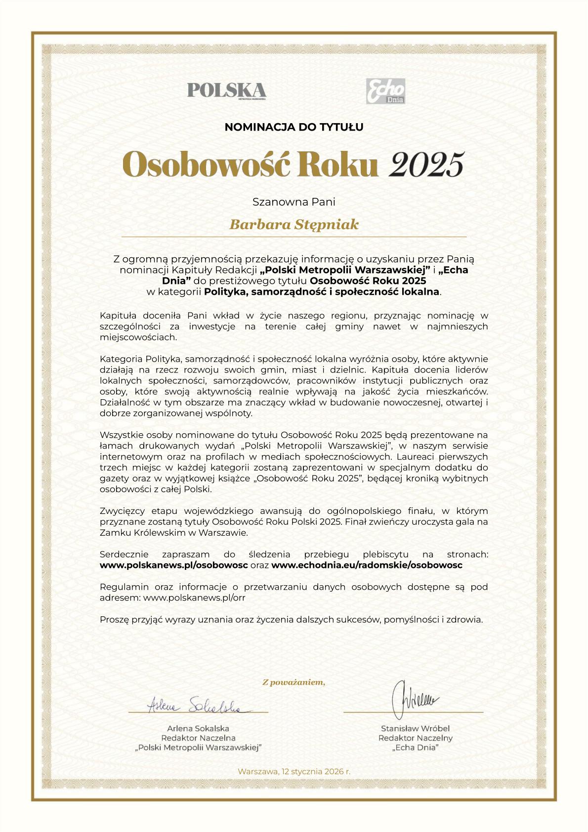 NOMINACJA DO TYTUŁU OSOBOWOŚĆ ROKU 2025