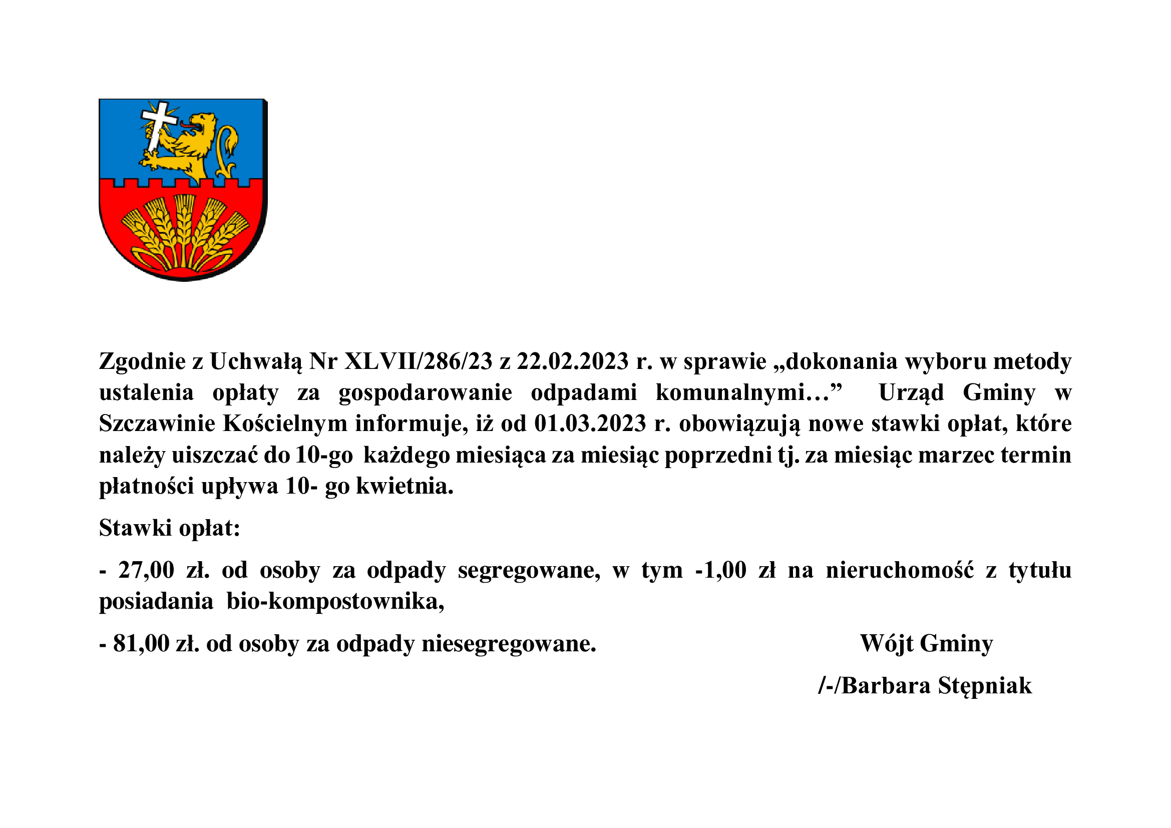 6. Stawka opłaty za odbiór i zagospodarowanie odpadów komunalnych od maja 2025 r. w gminie Szczawin Kościelny wynosi 31,00 zł od osoby;