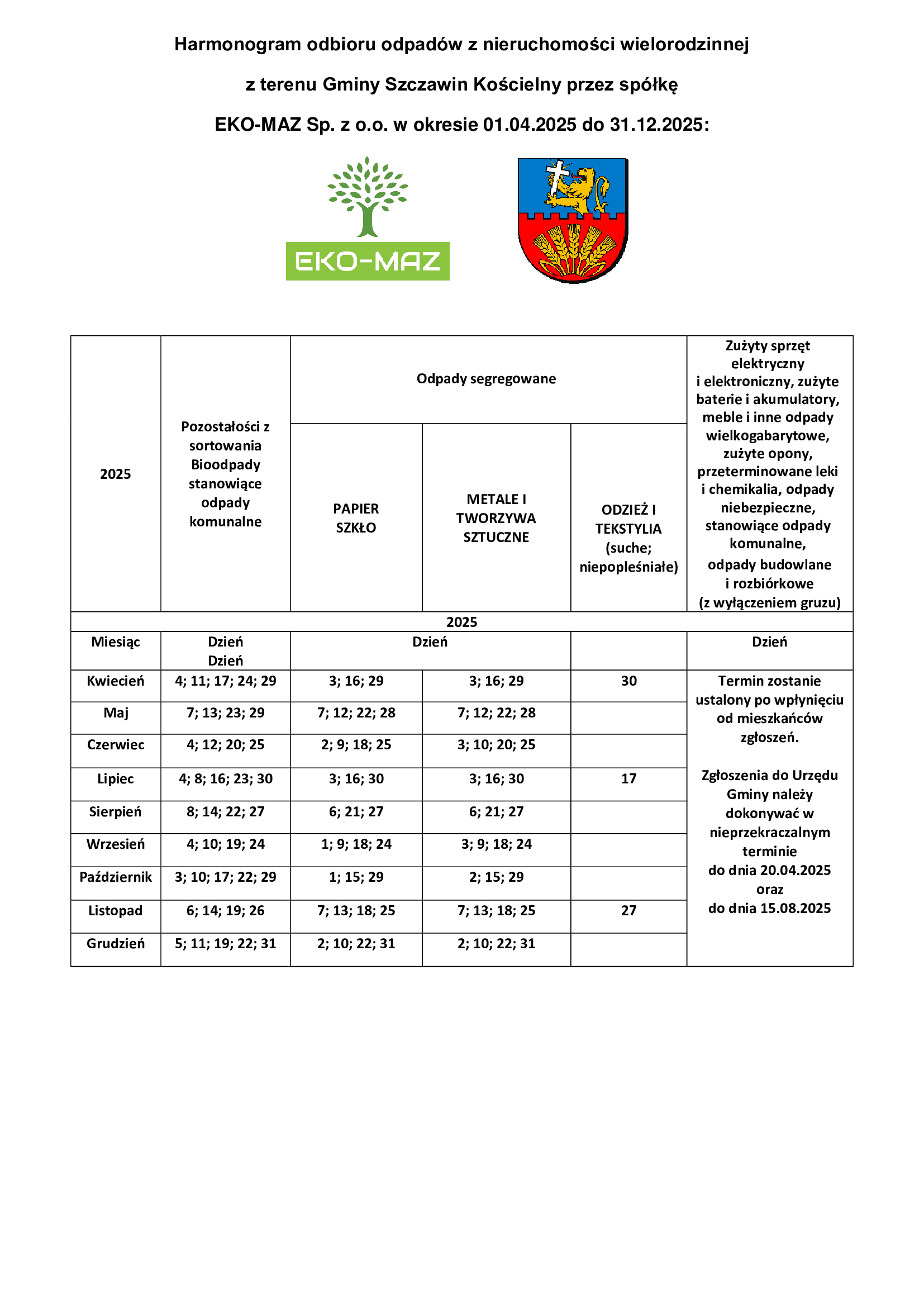 HARMONOGRAMY ODBIORU ODPADÓW KOMUNALNYCH: